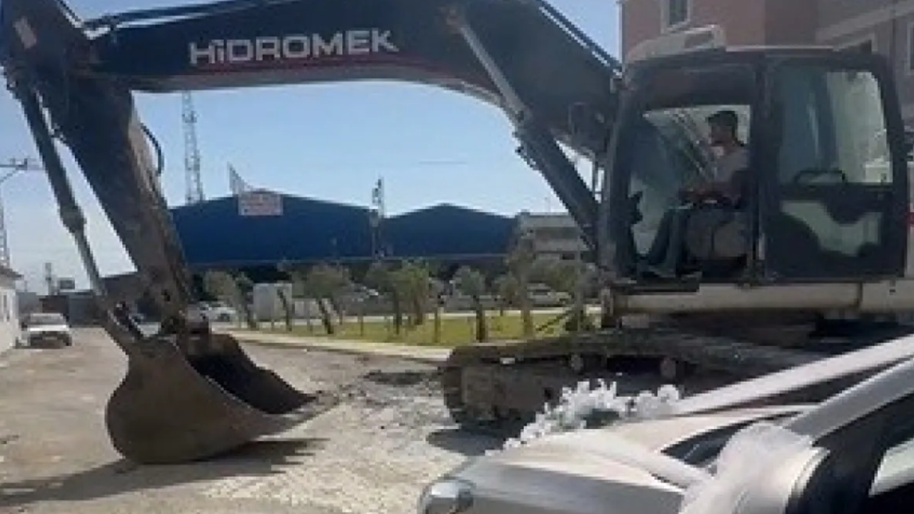 Mahallede yıkım çalışması yapan Hüsnüoğlu, binayı yıkacağı esnada karşıdan gelin arabasının geldiğini fark ederek iş makinesiyle gelin arabasının önünü kesti.