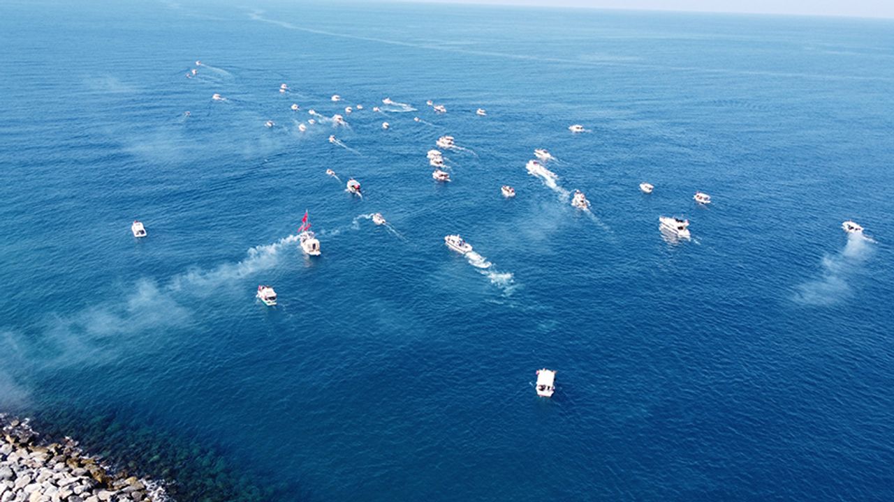Konuşma ve duaların ardından ellerinde Türk ve Filistin bayrakları taşıyan vatandaşlar, teknelere binerek Filistin'e destek sloganları attı.