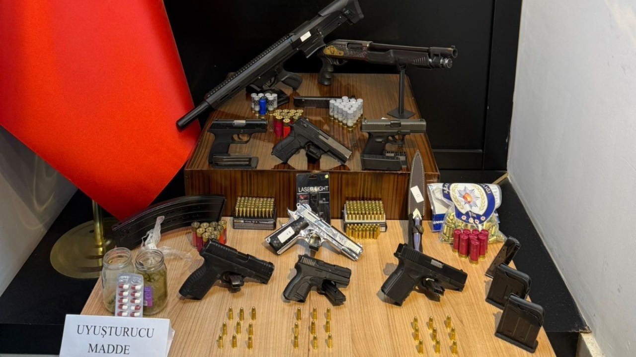 Adreslerde gerçekleştirilen aramalarda 6 ruhsatsız tabanca, 1 kuru sıkı tabanca, 2 pompalı tüfek, 1 kesici alet, 1 tabanca lazeri, 32 kartuş, 154 tabanca fişeği, 225 kuru sıkı tabanca fişeği ve bir miktar narkotik madde ele geçirildi.