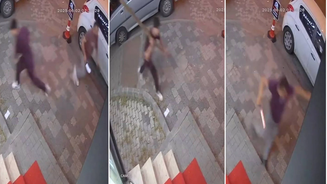 Eski çalışan iş yerine taş ve şişe fırlatırken, iş yerindekilerden biri satırla biri sopayla kovaladı.