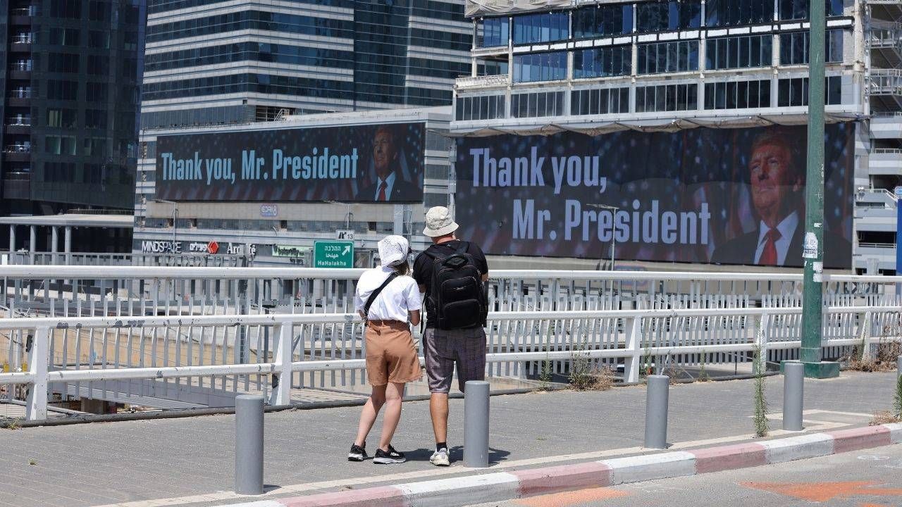 ABD'nin İran'a yönelik saldırılara katılmasını sağlamak amacıyla İsrail'de yürütülen kamuoyu kampanyası kapsamında, Trump'a hitaben "Bay Başkan, işi bitir" ifadesinin yansıtıldığı panoda, şimdi de "Teşekkürler Bay Başkan" ifadesine yer verildi.