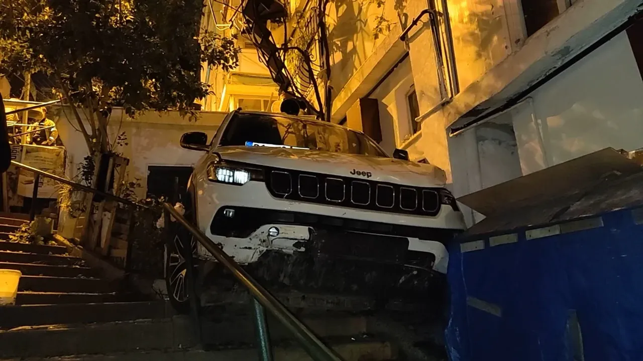 İstanbul - Beşiktaş'ta saat 00.15 sıralarında Ortaköy Tavukçu Remzi Sokak'ta, 01 EOS 88 plakalı cip, sokakta yokuş aşağı ilerlerken sürücüsünün direksiyon hakimiyetini kaybetmesi sonucu bina boşluğuna uçtu.