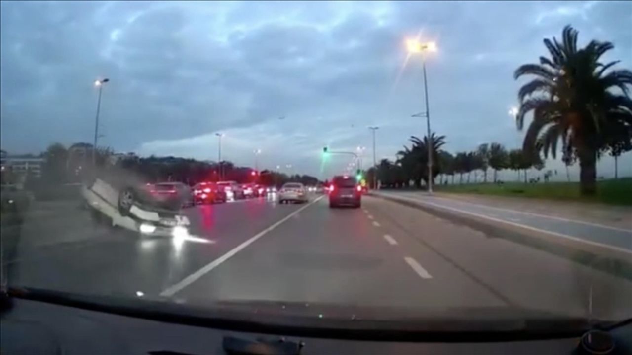 Sahil yolunda makas atarak ilerleyen bir otomobil, sürücüsünün direksiyon hakimiyetini kaybetmesi üzerine devrilerek metrelerce sürüklendi.