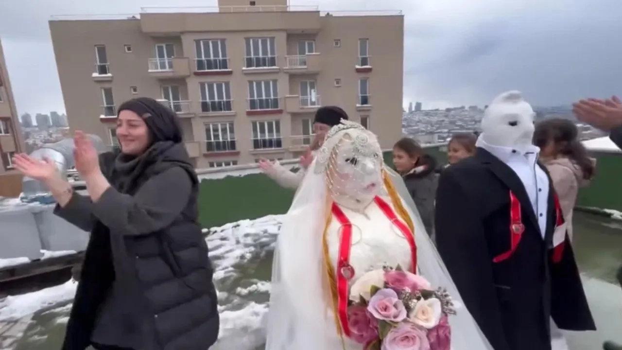 Ardından kardan adamlara gelinlik ve damatlık giydiren grup, düğün düzenleyerek eğlendi.