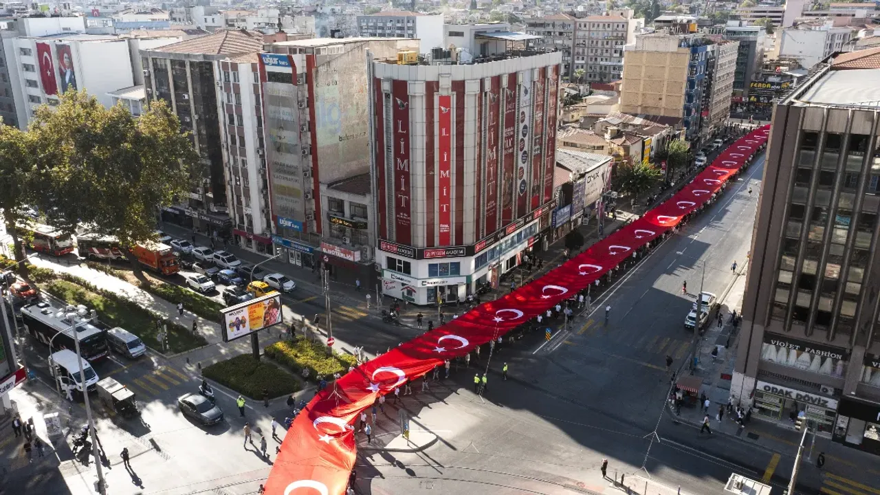Anafartalar Caddesi ile Cumhuriyet Meydanı arasında geçen yürüyüşte 350 metrelik dev Türk bayrağı taşınırken 7'den 70'e İzmirliler, yol kenarlarından da Türk bayrakları sallayıp, kentin kurtuluşunu kutladı.
