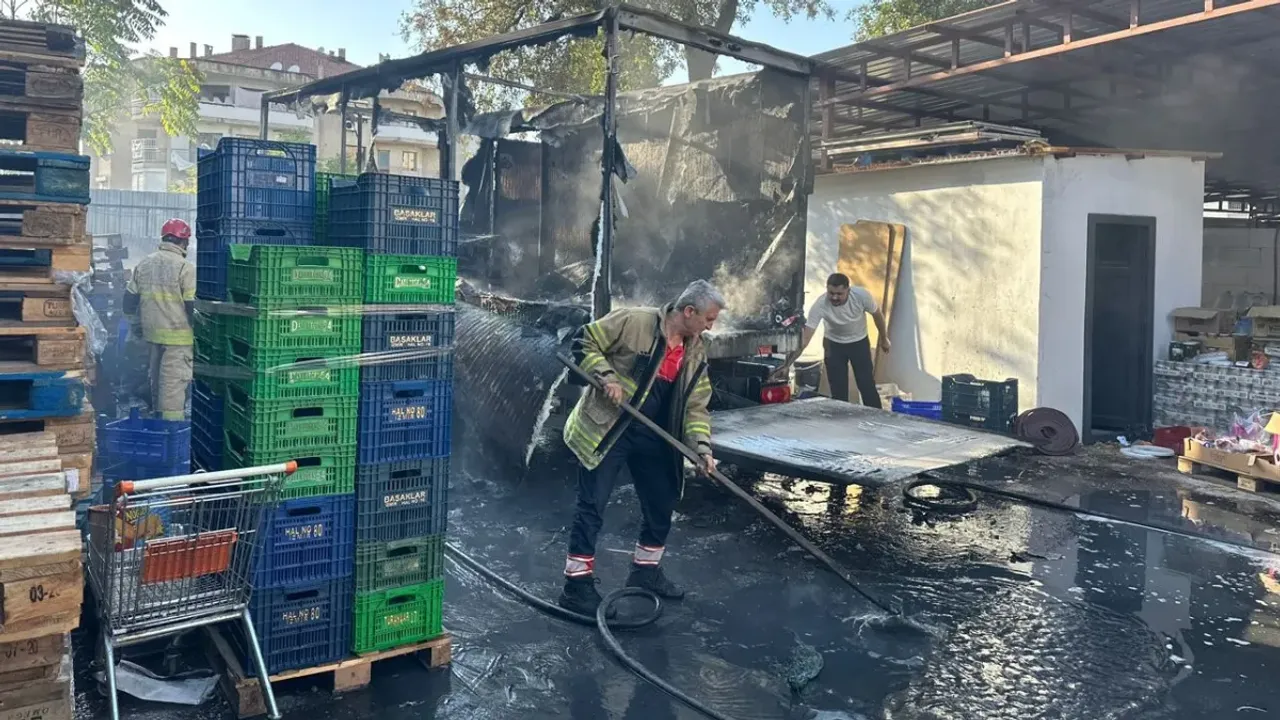 İzmir'de Konak ilçesinde saat 18.00 sıralarında Eski İzmir Caddesi üzerindeki bir marketin arka bahçesinde park halinde bulunan kamyon, henüz belirlenemeyen nedenle yanmaya başladı.