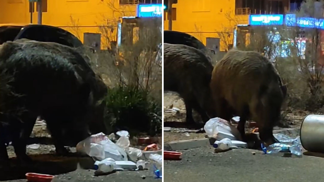 Çöp kutularının olduğu bir noktada zamanında toplanmayan çöpler, domuzların ilgisini çekerken, o anlar bir vatandaş tarafından cep telefonuyla kaydedildi.