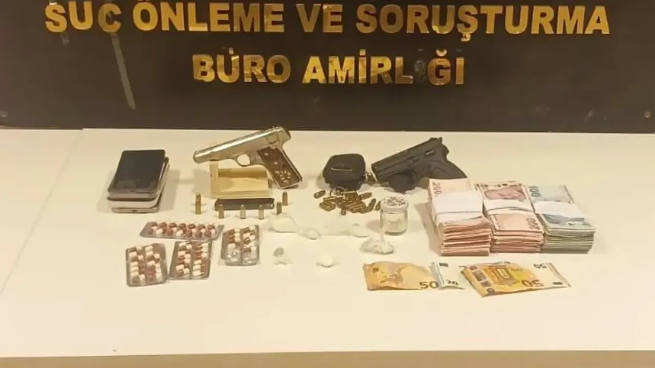 Şahısların üzerlerinde ve adreslerinde yapılan aramalarda 2 adet ruhsatsız tabanca, 35 adet 7.65 mm fişek, 49 adet uyuşturucu nitelikli hap, 91 gram metamfetamin ve uyuşturucudan elde edildiği değerlendirilen 178 bin 900 TL geçirildi.