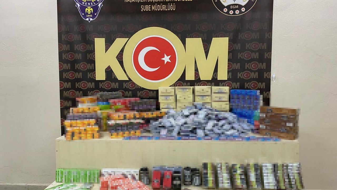 Yapılan aramalarda piyasa değeri yaklaşık 6 milyon TL olduğu tespit edilen toplam 1 milyon 800 bin adet içi doldurulmuş makaron, 30 bin boş makaron, gümrük kaçağı 10 bin 62 paket sigara, 2 bin 380 adet puro ve 381 kilo tütün, 1670 litre taklit etiketli etil alkol, 59 şişe muhtelif içki, 1168 gümrük kaçağı parfüm, 13 elektronik sigara cihazı ele geçirildi.