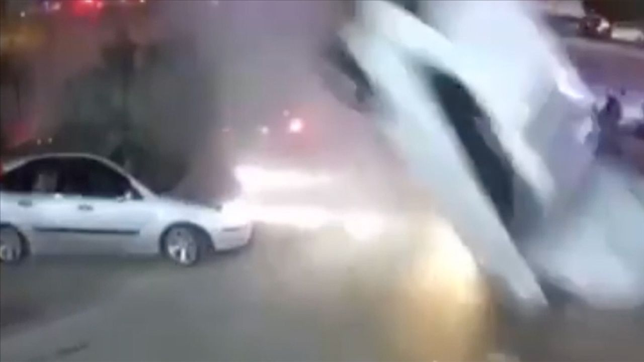 Görüntülerde, aracın kaldırıma çarpıp havalanarak park halindeki 3 aracın üzerinden geçtiği ve sürüklendiği görüldü. Kayıtlarda ayrıca çevredekilerin panik anları da yer aldı.