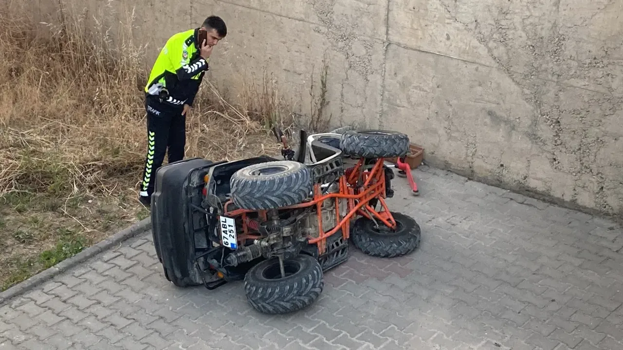 ATV sürücüsü T.Ü. ile arkasında bulunan C.Ü. (7) yola düştü. Sürücüsüz şekilde giden ATV ise yoldan çıkarak yaklaşık 4 metre yükseklikteki istinat duvarından apartmanın bahçesine düştü.