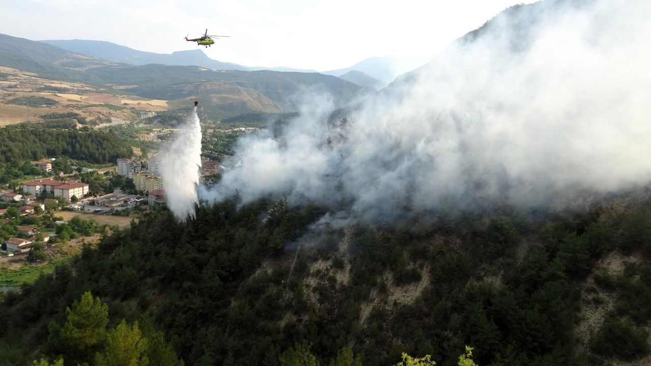 Yüksek ve eğimli bölgede de etkili olan alevlere 3 helikopter, 58 araç, 164 personelle müdahale edildi.
