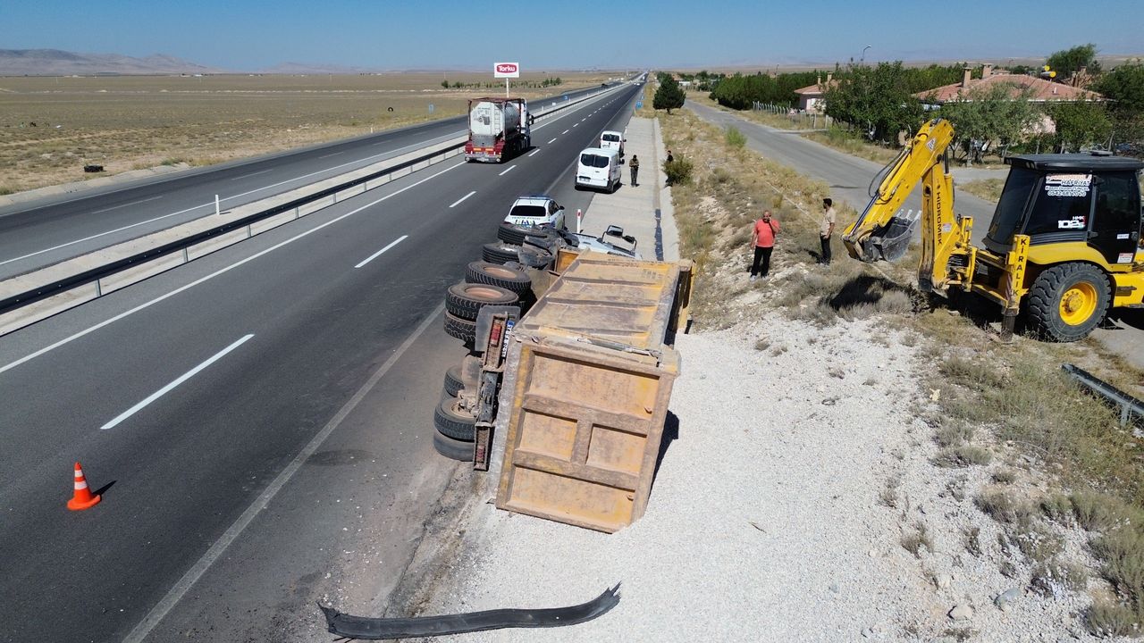 Karaman-Ereğli Karayolu’nun 22. kilometresinde Organize Sanayi Bölgesi’nden yüklediği mıcırı Yeşildere TOKİ konutlarına götürdüğü öğrenilen Ş.A. idaresindeki kamyon, sürücüsünün direksiyon hakimiyetini kaybetmesi sonucu kontrolden çıkarak yol kenarına devrildi.