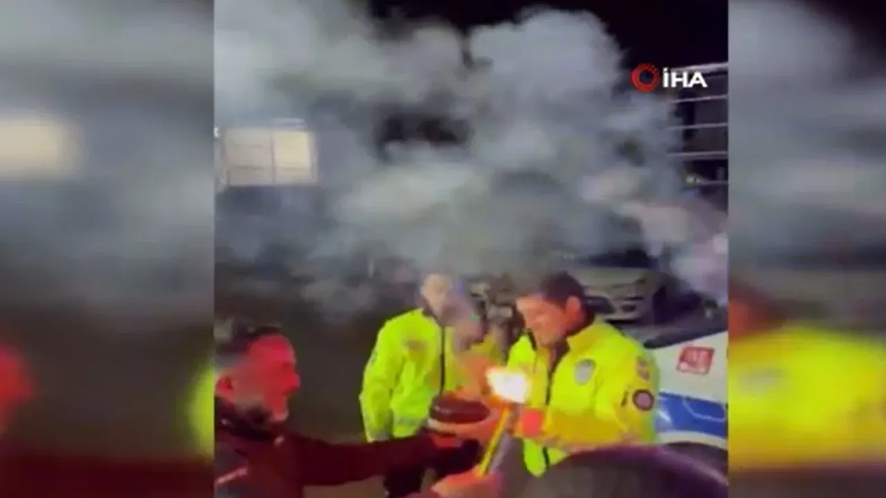 Polisleri meşalelerle karşılayan oto tamir ve bakım ustaları, polislere pasta da ikram etti.
