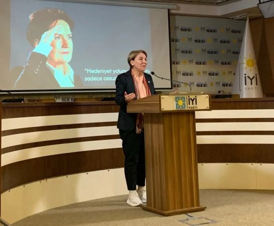 Türkiye Diyanet Vakfı Kadın Kolları eski başkanı ve İyi Parti İçi Eğitim sorumlusu Ayşe Sucu, 64 yaşında başörtüsünü çıkararak kürsüye çıktı.