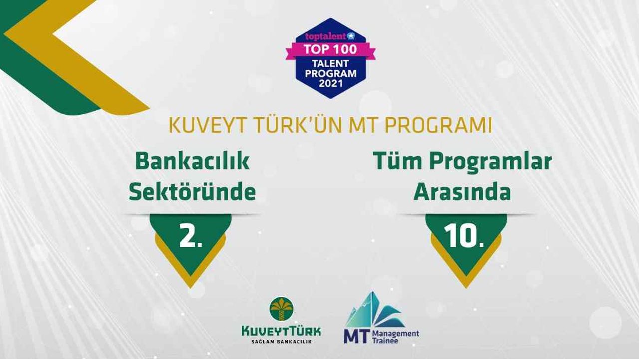 Kariyerine katılım finans alanında başlamak isteyenlere sunduğu imkânlarla öne çıkan Kuveyt Türk’ün, gelecekteki yöneticilerini yetiştirmeyi amaçlayan MT (Management Trainee) programı, Türkiye’nin önde gelen iş ilanı ve kariyer platformlarından Top Talent’in “Top100 Talent Program” yarışmasında bankacılık sektöründe ikinci, tüm yetenek programları arasında ise 10. sırada yer aldı. www.toptalent.co sitesi tarafından düzenlenen ve yılın en iyi yetenek programlarının seçildiği yarışmada, 23 bin 850 genç yetenek oy kullanarak 113 yetenek programı arasında seçim yaptı.