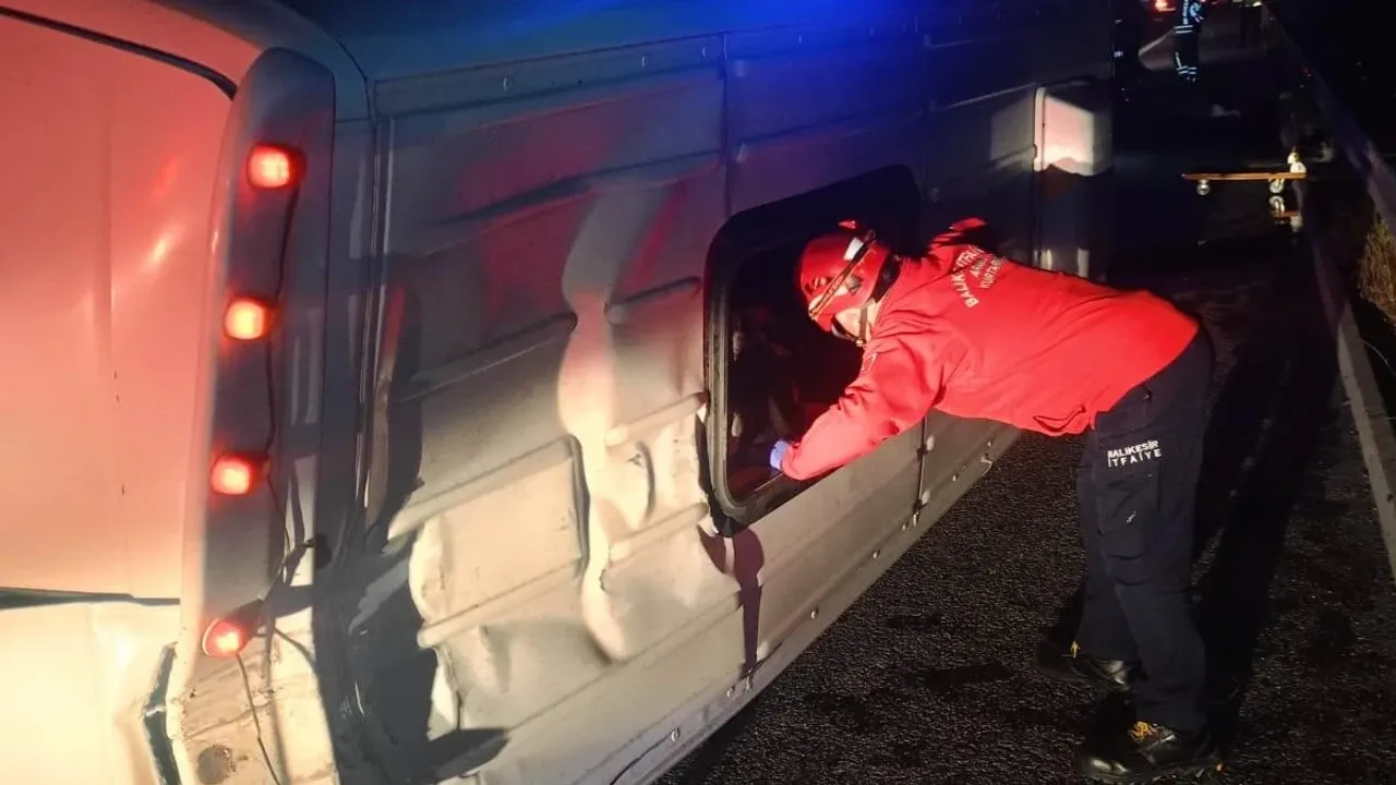 Manisa’da akşam saatlerinde Gebze-Orhangazi-İzmir Otoyolu'nun Soma ilçesi sınırlarında, Balıkesir istikametine seyir halinde olan 34 KUF 316 plakalı Mercedes marka servis minibüsü henüz belirlenemeyen bir nedenle sürücüsünün kontrolünden çıkarak yolun sağ tarafına devrildi.