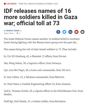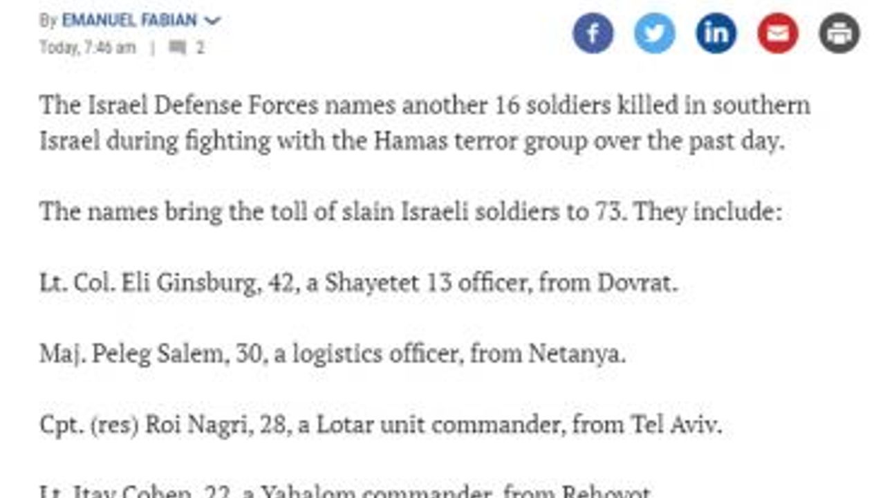 Ağır kayıplar veren İsrail, İzzeddin Kassam Tugayları tarafından öldürülen 16 askerin daha kimliğini açıkladı. İsrail basını, Mavi Marmara başta olmak üzere İsrail'in deniz operasyonlarını yöneten İsrail Deniz Kuvvetleri subayı Elie Gensberg'in, Hamas'ın operasyonunda öldürüldüğünü yazdı.