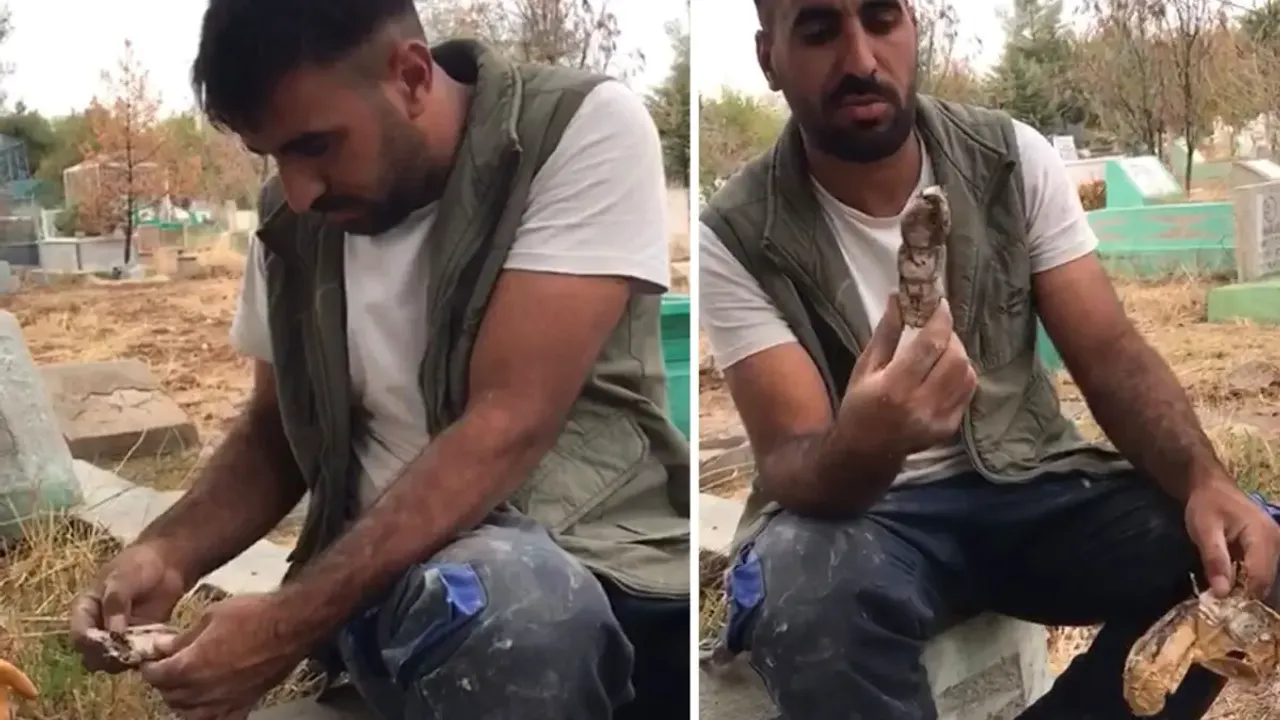 Diyarbakır'ın Bağlar ilçesinde bulunan Yeniköy Mezarlığı'nda mezar kazan Barış Karabulut, gördüğü manzara karşısında şaşırdı.