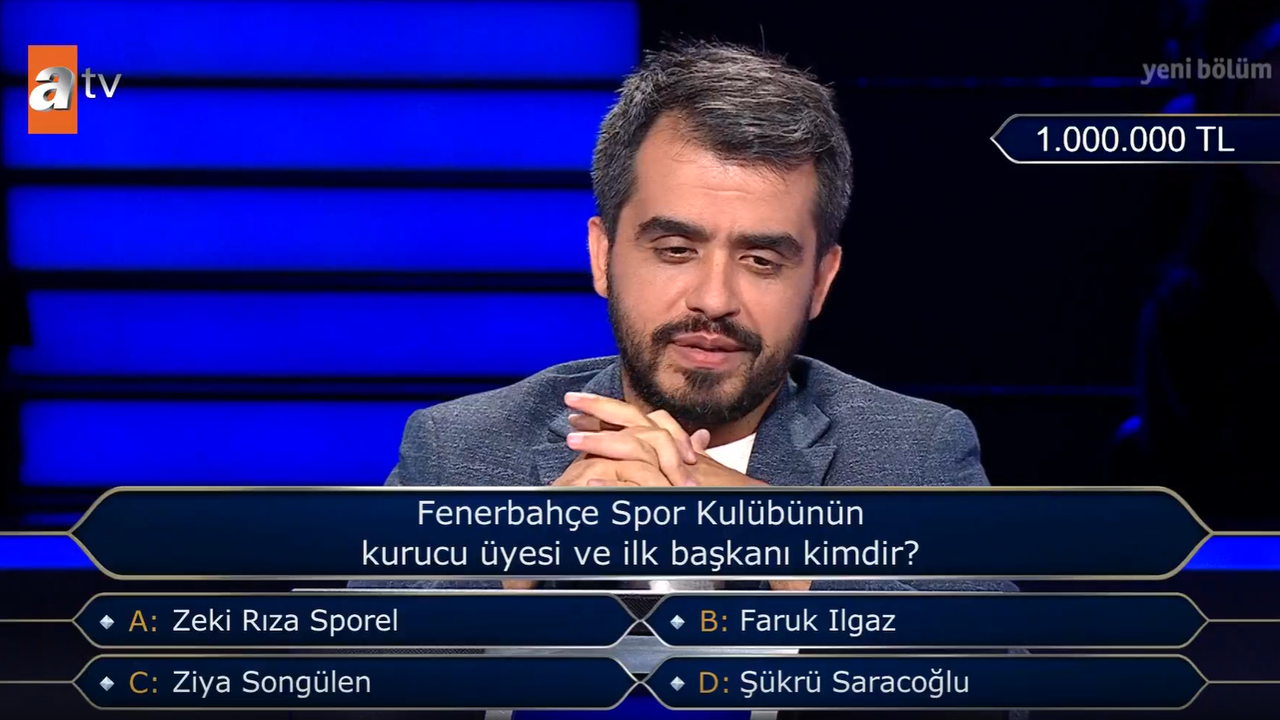 ATV ekranlarında yayınlanan ''Kim Milyoner Olmak İster?'' yarışmasında yarışmacıya 1 milyon TL değerindeki 'Fenerbahçe Spor Kulübünün kurucu üyesi ve ilk başkanı kimdir?' sorusu soruldu.