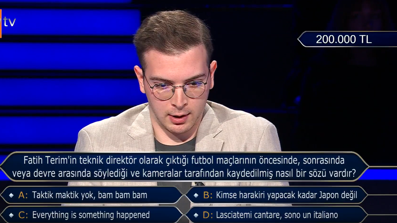 Yarışmanın 200 bin TL'lik sorusunda, ''Fatih Terim'in teknik direktör olarak çıktığı futbol maçlarının öncesinde, sonrasında veya devre arasında söylediği ve kameralar tarafından kaydedilmiş nasıl bir sözü vardır?'' sorusunda şıklar şu şekilde yer aldı: