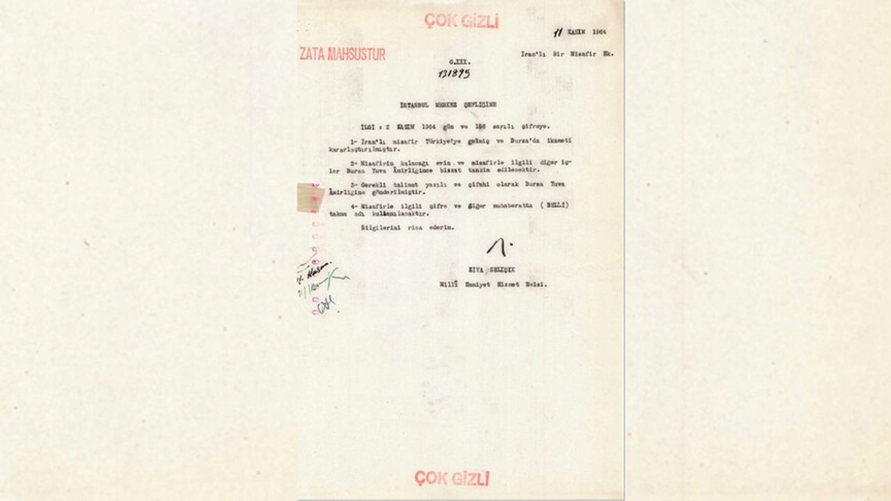 Belge, İran devriminin lideri Ayetullah Humeyni'nin, 4 Kasım 1964 ile 5 Ekim 1965 tarihleri arasında MİT'in gözetiminde Türkiye'de ikameti kapsamında Milli Emniyet Hizmeti Reisi Ziya Selışık imzasıyla İstanbul Merkez Şefliği'ne "çok gizli" ibaresiyle gönderilen 11 Kasım 1964 tarihli emir yazısını içeriyor.