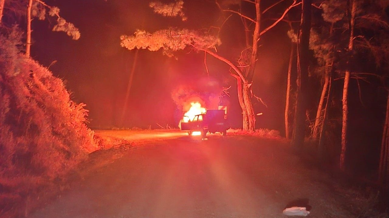 Hızla olay yerine ulaşan ekipler, alev topuna dönen araç yangınını ormanlık alana sıçramadan söndürmeyi başardı. Ekipler soğutma çalışması gerçekleştirirken yangında araç kullanılamaz hale geldi.