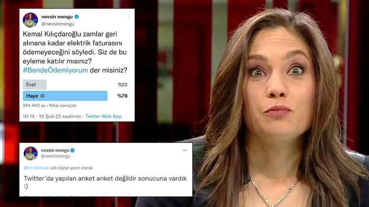 Öte yandan Nevşin Mengü, ankette kendisini şaşkına çeviren sonucun çıkmasıyla ilgili, "Twitter'da yapılan anket anket değildir sonucuna vardık." dedi.