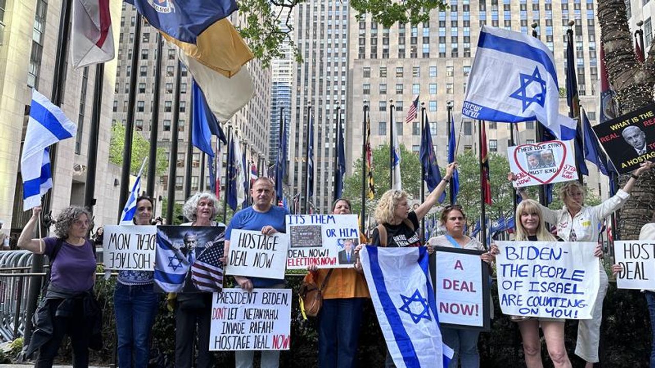 Ellerinde İsrail bayrakları ve “Savaşı durdur", "Hemen rehineler için anlaş” yazılı pankartlar taşıyan grup, ABD Başkanı Joe Biden’a da Netanyahu’nun Refah’ı işgal etmesini önlemesi çağrısı yaptı.