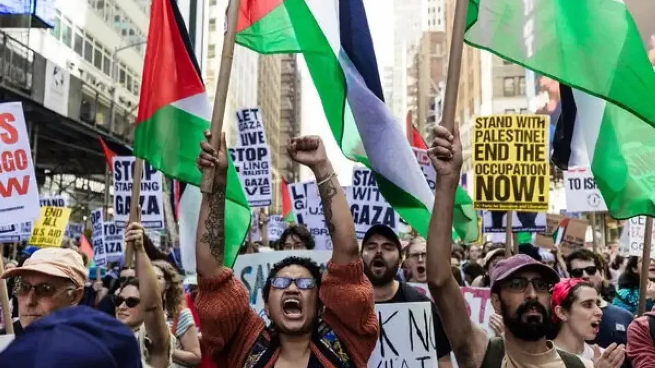 Göstericiler, New York'un ünlü Times Meydanı'nda bir araya gelerek BM merkezinin karşısındaki 46'ncı sokağa yürüdü. Binlerce kişi, "Özgür Filistin, Özgür Gazze" sloganları attı.