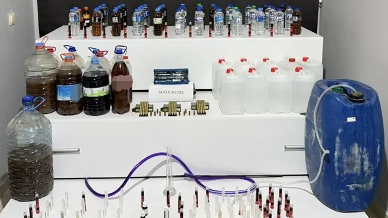 Tespit edilen adreslere gerçekleştirilen operasyonda, 68 litre ve 47 şişe sahte içki, 45 litre etil alkol, 64 alkol yapım kiti ve 160 tabanca fişeği ele geçirildi.