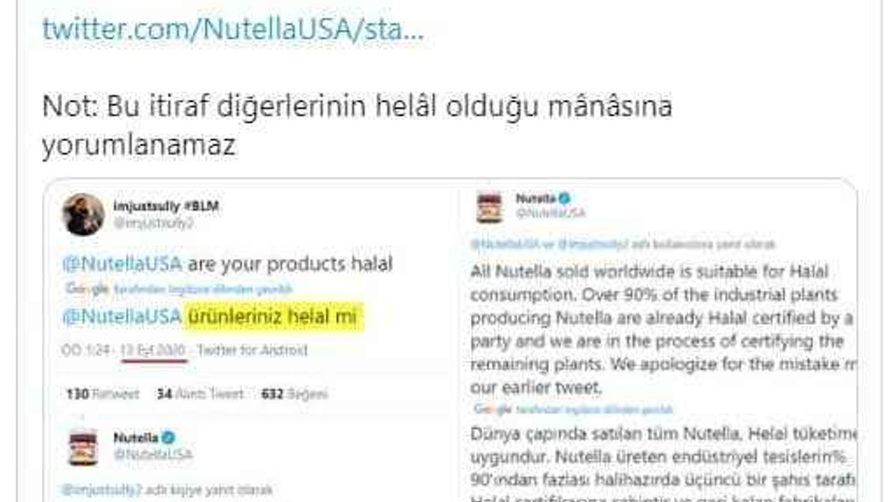 Firma, ”Dünya çapında satılan tüm Nutella, Helal tüketime uygundur. Nutella üreten endüstriyel tesislerin% 90’ından fazlası halihazırda üçüncü bir şahıs tarafından Helal sertifikasına sahiptir ve geri kalan fabrikaları sertifikalandırma sürecindeyiz. Daha önceki tweet’imizde yaptığımız hatadan dolayı özür dileriz” açıklamasında bulundu.