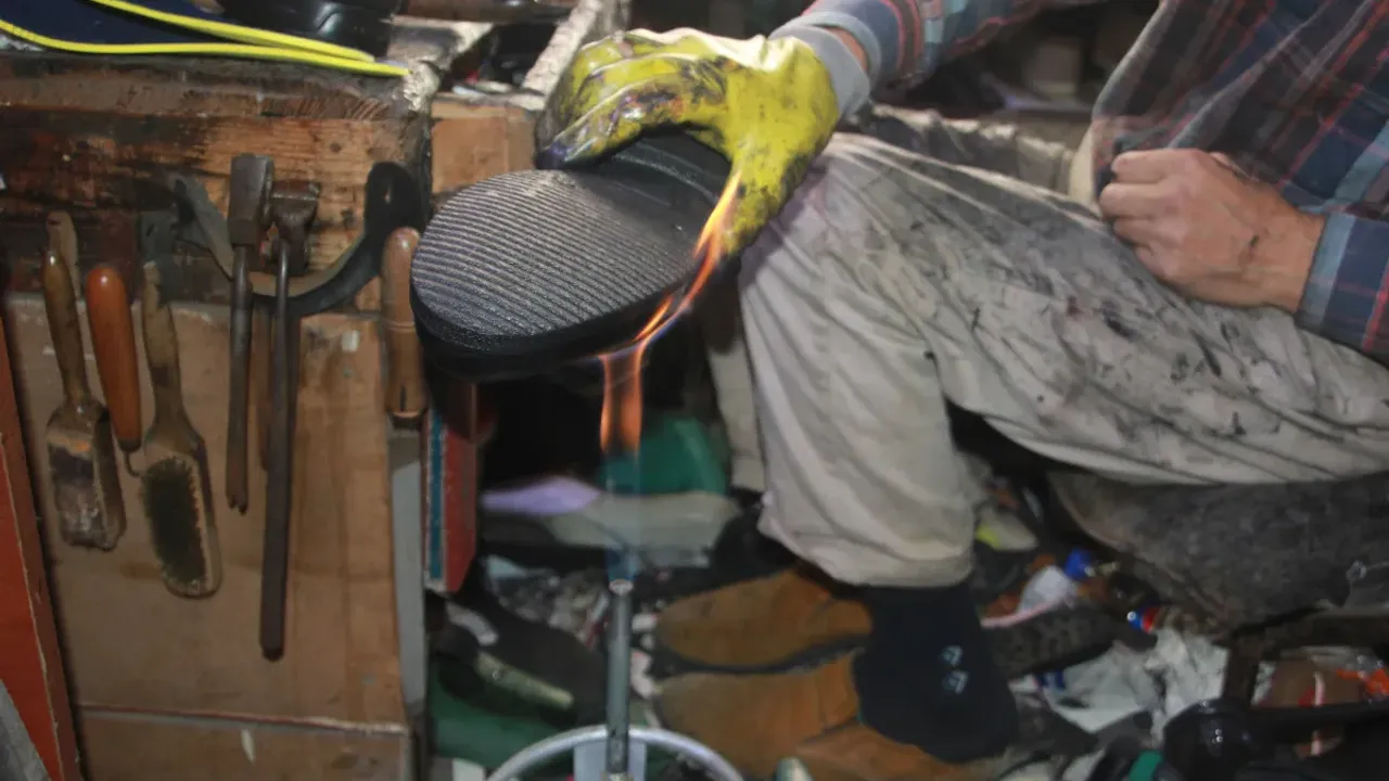 Aydın, imalatın son aşamasında ayakkabıları ateşle buluşturduklarını belirterek, bu yöntemin gerçek deriyle sahte deriyi ayıran bir işlem olduğunu söylüyor.