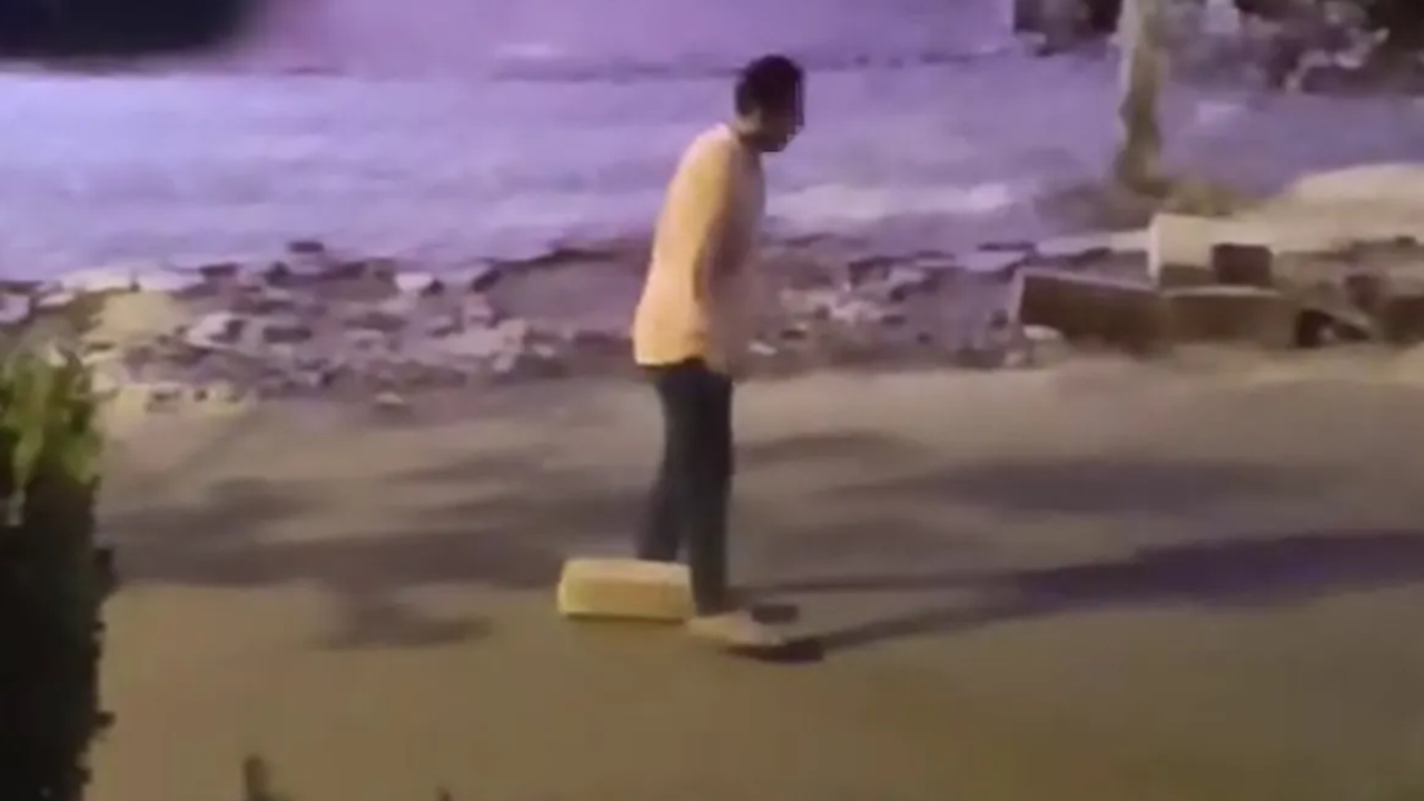 Araçları durmakta başarılı olamayan şahıs, taşı yolun ortasına kadar itekleyerek ilerletti.