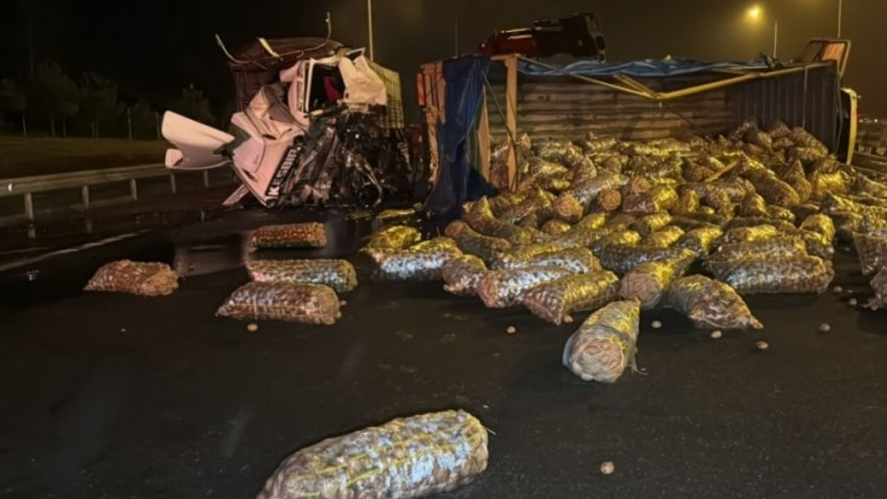 Kaza, Anadolu Otoyolu'nun Bolu Dağı Tüneli geçişinde Düzce il sınırında, Ekrem Özdemir Viyadüğü'nde meydana geldi. Edinilen bilgiye göre, İstanbul istikametinde seyreden patates yüklü bir kamyon kontrolden çıktı. Sürücüsünün direksiyon hakimiyetini kaybettiği kamyon, otoyolda devrildi. 3 şeridi kapatan kamyona, aynı istikamette seyreden tır çarptı. İlk belirlemelere göre meydana gelen kazada 2 kişi yaralandı. İhbar üzerine bölgeye sağlık, polis ve itfaiye ekipleri sevk edildi.