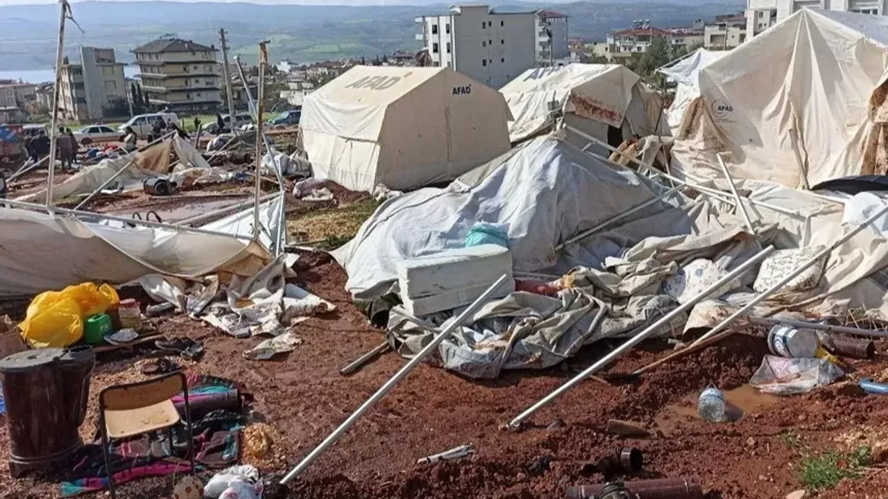 Olay, Kahramanmaraş'ın Pazarcık İlçesinde meydana geldi. Fırtına nedeniyle hasarlı binaların çatısından kopan parçalar etrafa savruldu, depremzedelerin kaldığı çadırlar havaya uçtu.
