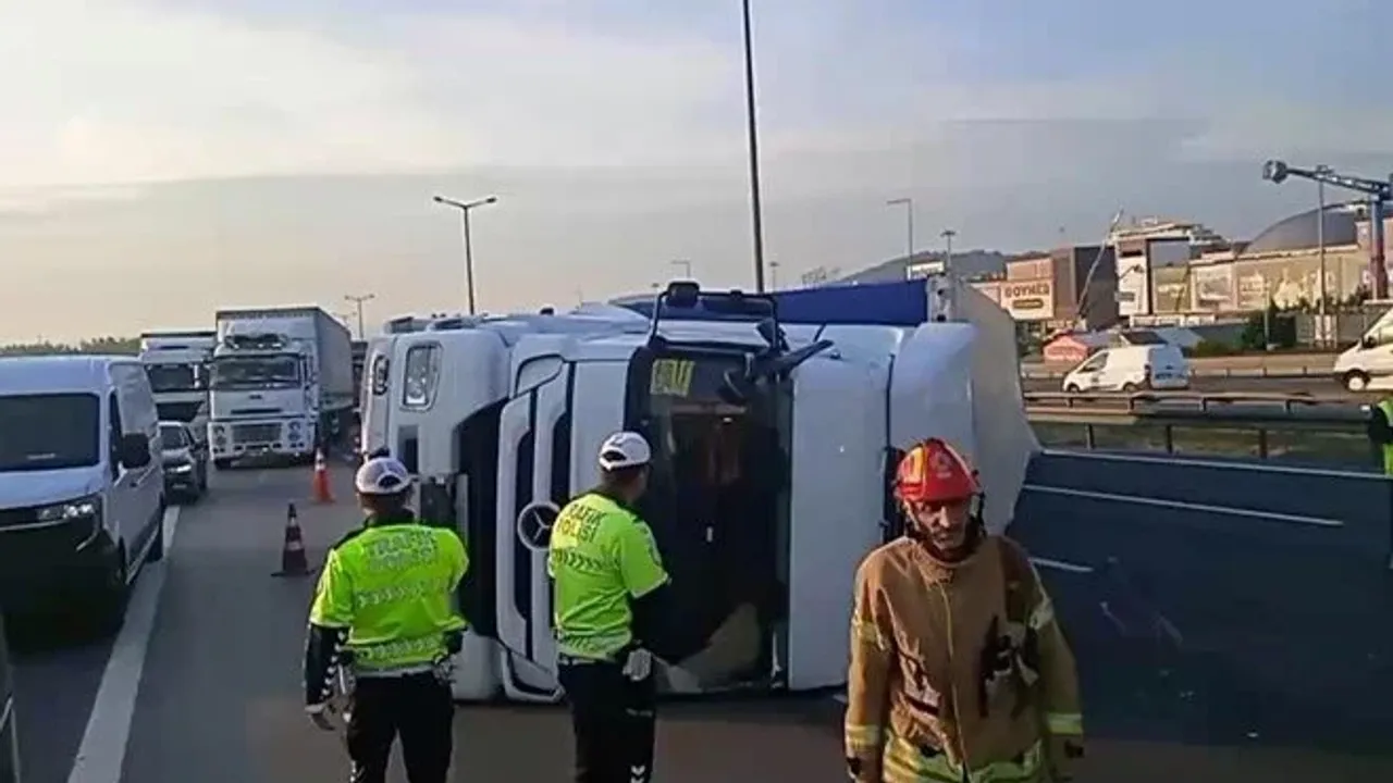 Kurtköy TEM Otoyolu'nda seyir halinde olan bir TIR, henüz bilinmeyen bir nedenle devrildi.