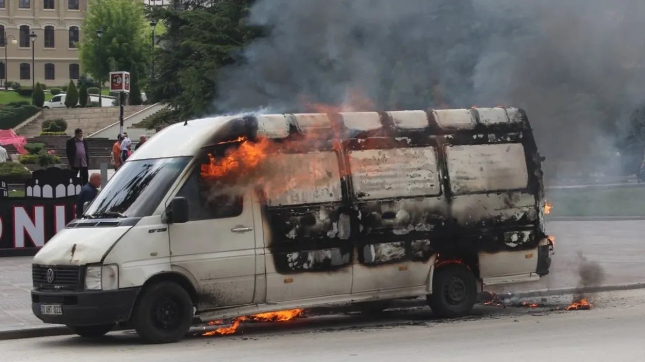 Aracın içinden aldığı şişedeki benzini aracın üzerine döken şahıs, panelvan aracı ateşe verdi.