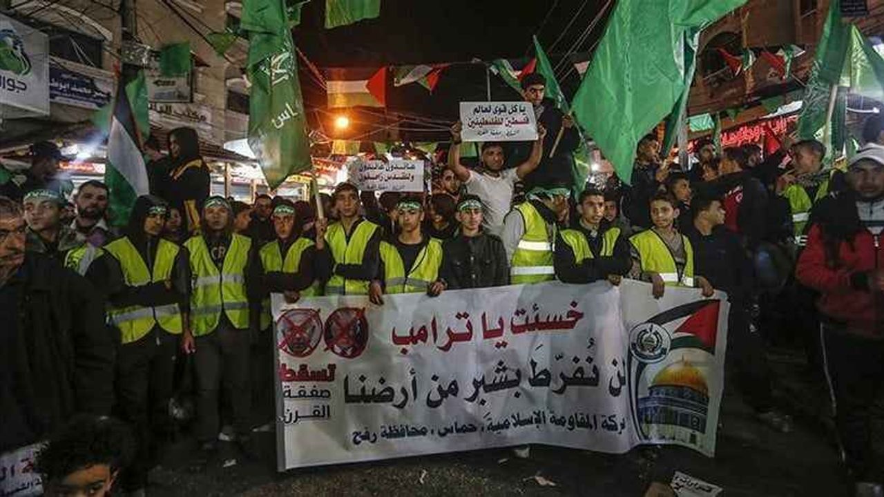 Hamas yöneticilerinden Mansur Berik, gösteride yaptığı konuşmada, planı ve Filistin meselesini tasfiye etmeye çalışan tüm projeleri reddettiklerini belirtti.
