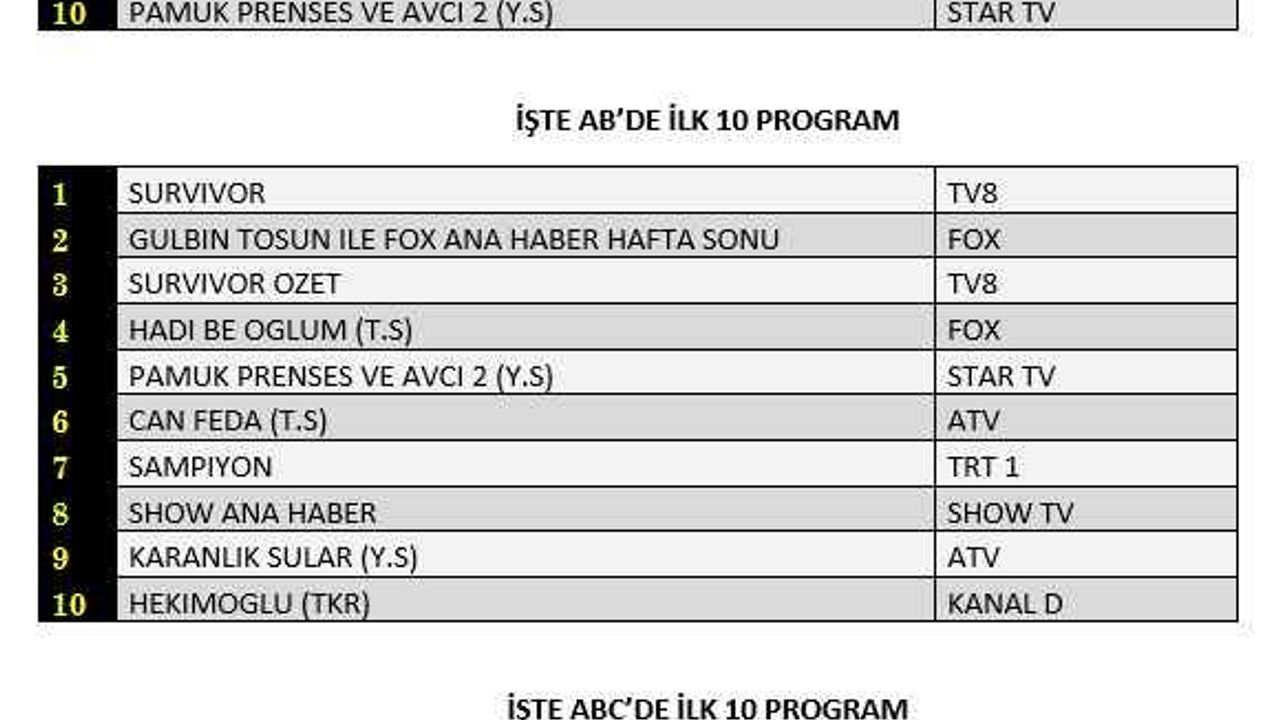 AB, TOTAL ve ABC’de 1 Mart Pazar reyting sonuçları belli oldu! İşte Gülbin Tosun, Survivor, Can Feda, Hadi Be Oğlum reyting sonuçları!.. Dün hangi yapım daha çok izlendi merak ediliyor. Bazı diziler ve TV programları 27 Şubat’ta 36 Mehmetçiğimizin İdlib’de şehit olduğu kalleş saldırının ardından yayınlarına ara verdi. Yayına devam eden yapımlar arasındaki Survivor Pazar reyting sonuçları ve diğer film ve dizilerin reyting sıralaması ise ilgililerince araştırılmakta. Reytingler, yapımların ekranlardaki yayın ömrünü belirlemek adına kanal yöneticileri ve yapımcılar açısından büyük öneme sahip. Bu kapsamda Reyting sonuçları belli oldu! İşte 1 Mart Pazar Gülbin Tosun, Survivor, Can Feda, Hadi Be Oğlum reyting sonuçları sıralaması ilk 10!.. ATV, Kanal D, Show Tv, Star Tv, TRT 1, Fox Tv, TV8, Kanal7 ve diğer kanallarda yer alan dizi, film ve programların reyting sonuçları… Detaylı bilgi haberimizde.