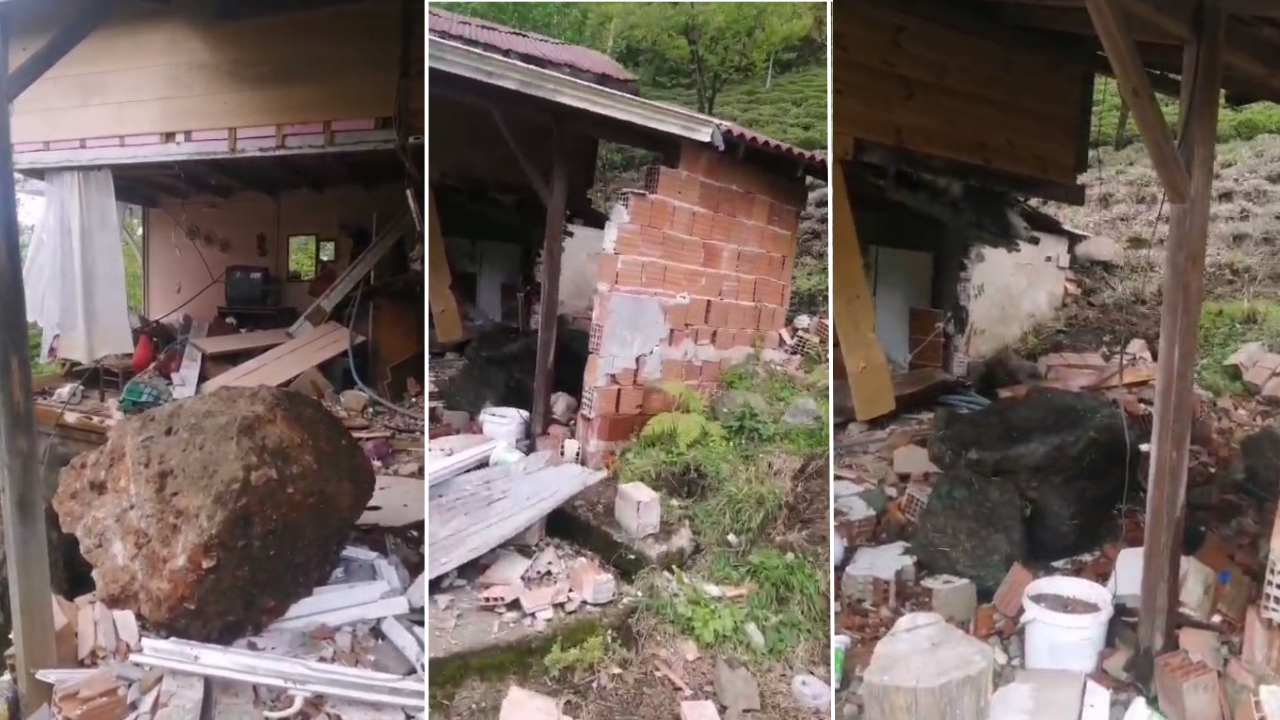 Yamaçtan kopan toprak ve büyük kaya parçaları aşağıdaki tek katlı eve çarptı.