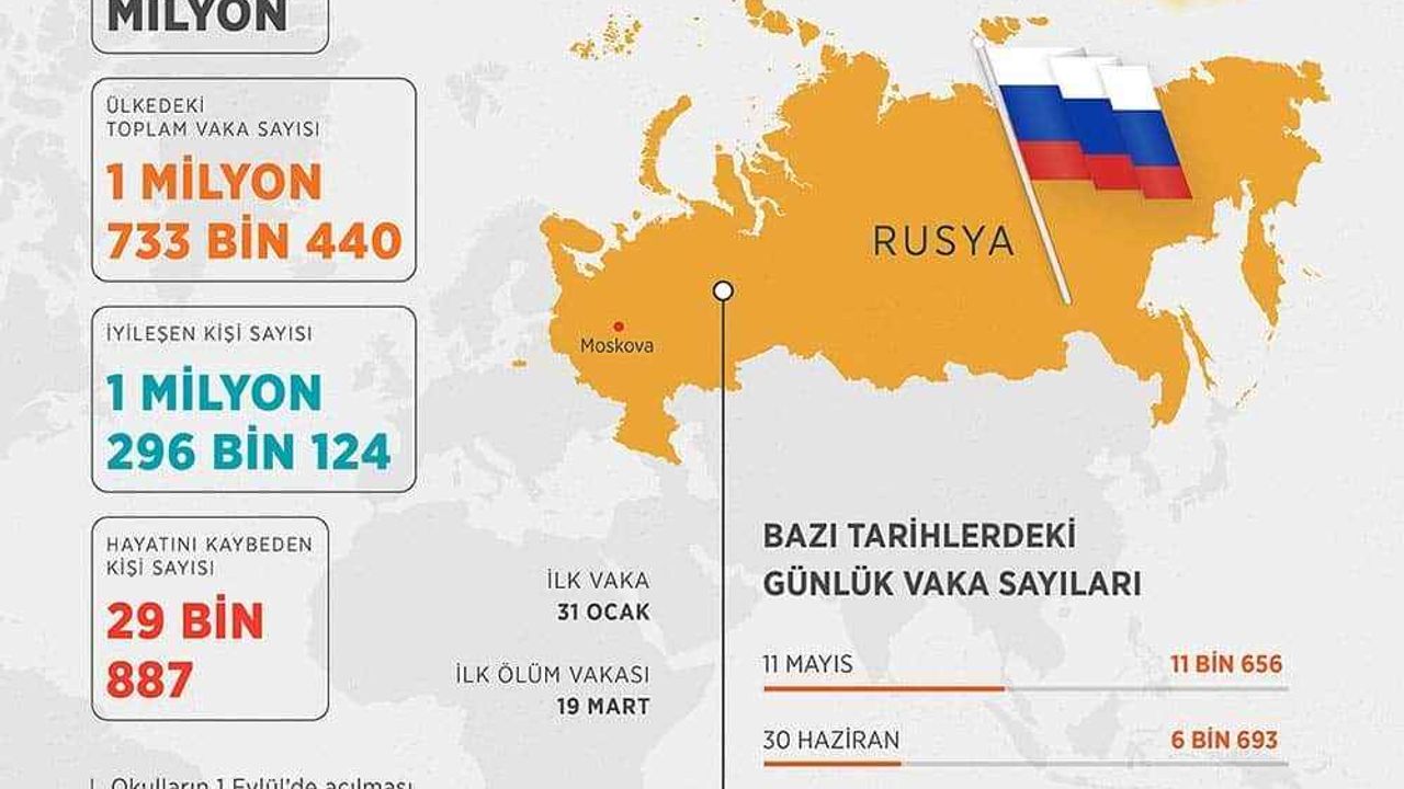 Kovid-19 vakasının ilk olarak 31 Ocak’ta tespit edildiği, virüs nedeniyle ilk vefatın da 19 Mart’ta olduğu Rusya’da, salgının başlangıcından bu yana 20 bin 582 vakayla “en yüksek günlük rakam” görüldü.