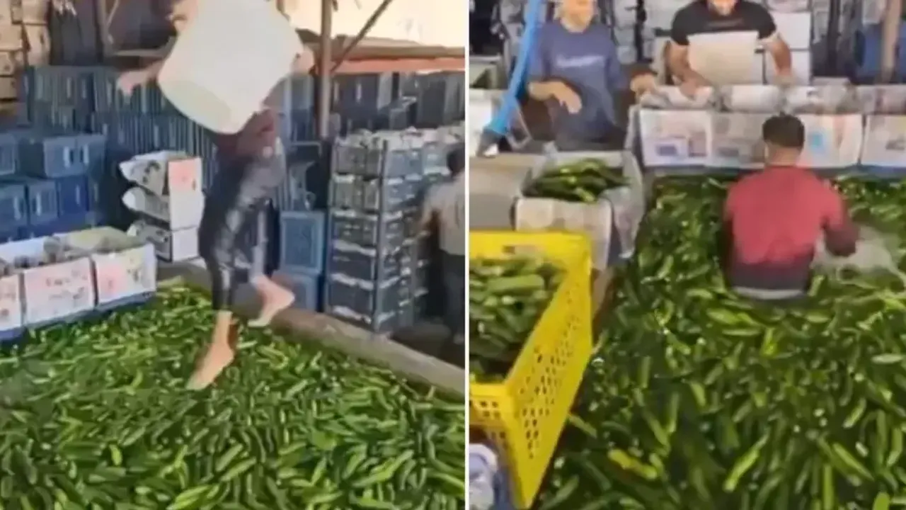 Sosyal medyaya düşen görüntülerde salatalıkların yıkandığı havuza vücudunu sokarak giren işçi paketleme kasalarına salatalıkları doldurmaya çalışıyordu.