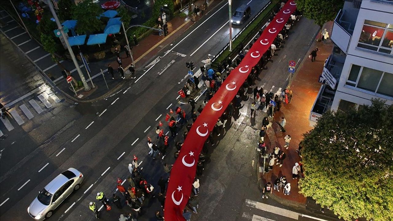 Samsun Valiliği tarafından gerçekleştirilen etkinlikte, Onur Anıtı önünde toplanan vatandaşlar, yağmur altında ellerindeki fener ve Türk bayraklarıyla yürüdü.