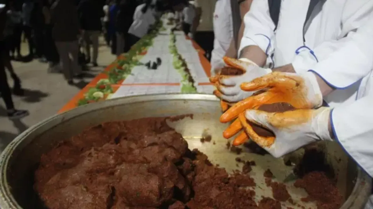 Halfeti Meslek Yüksekokulu ve Sosyal Bilimler Meslek Yüksekokulu Aşçılık Bölümlerinin öğrencileri, alana kurulan masaların üzerine lavaş ekmekleri dizdikten sonra şefler de yoğrulan çiğ köfteyi ekmeğe çekti.