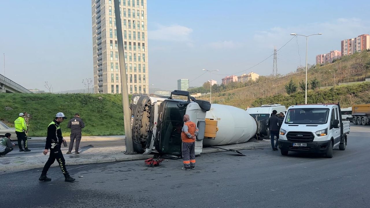 Beton mikseri çarpmanın etkisiyle devrildi. Devrilen beton mikserinden yola mazot aktı.