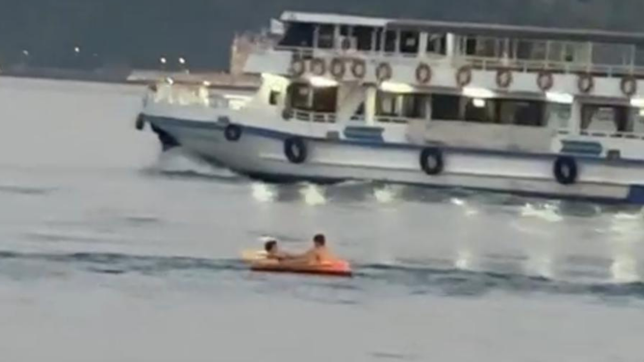 Bu sırada oradan geçen bir tur teknesinin oluşturduğu dalgalar nedeniyle çocukların botta güçlükle durdukları görüldü.