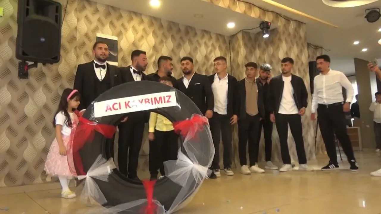 Sivas’ın Altınyayla ilçesinde dünyaevine giren Burak Kaya, düğününde arkadaşlarının yaptığı ilginç sürprizle şaşkınlık yaşadı. Tır şoförü olan damada, arkadaşları takı merasiminde süslenmiş bir tır lastiği hediye etti. Lastiğin üzerine “Acı kaybımız” yazısı da eklendi.