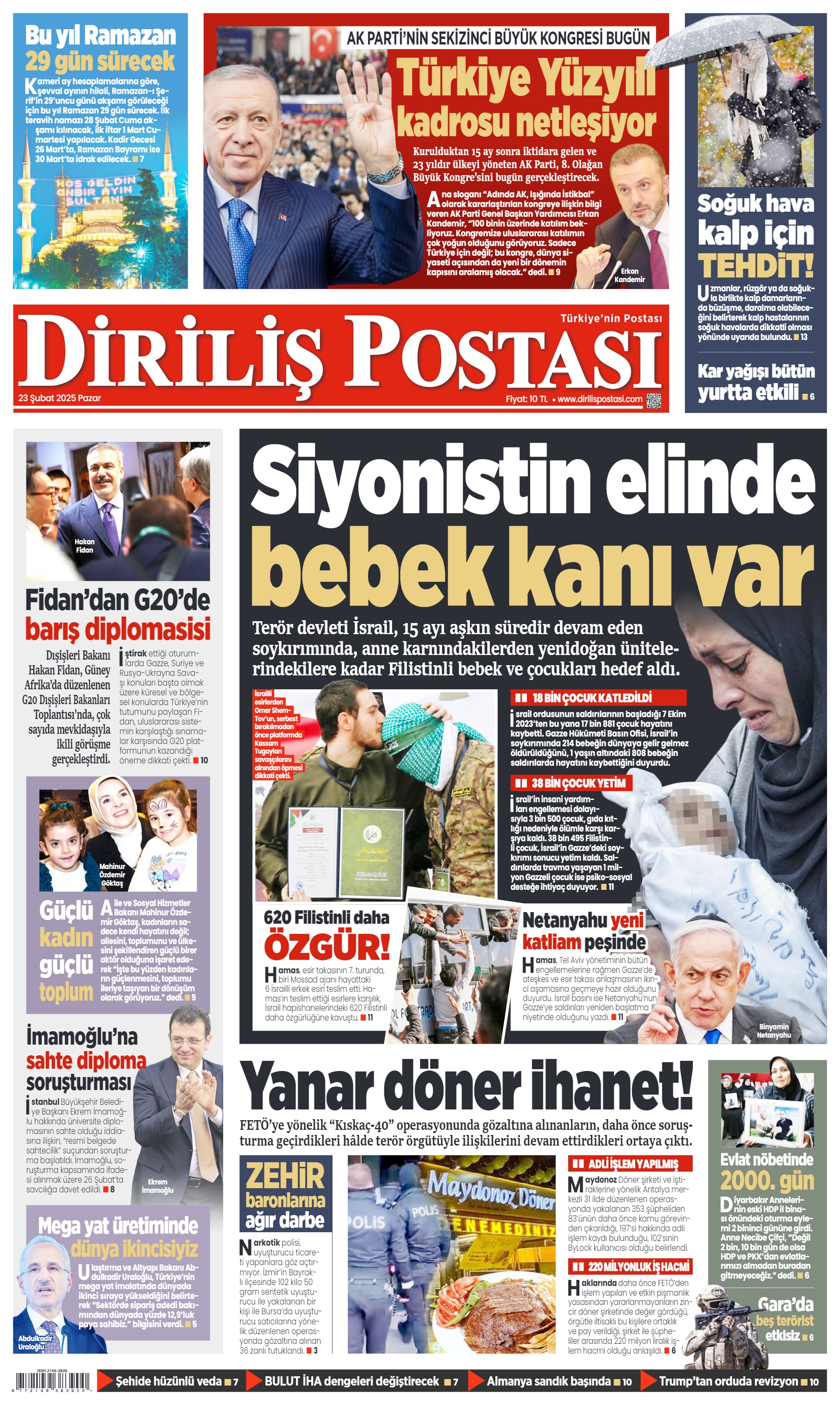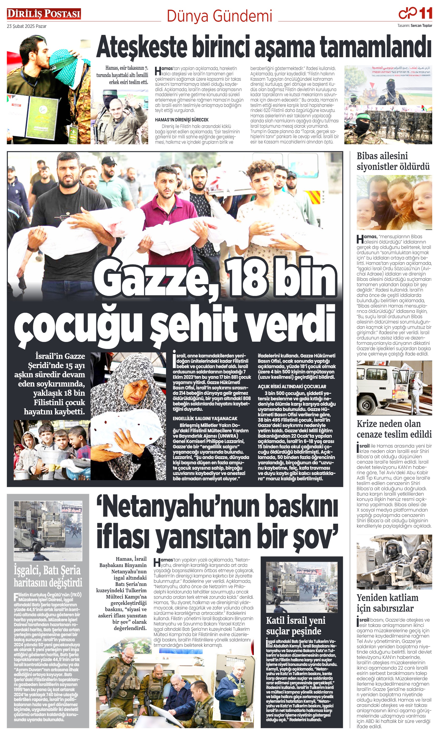 Direniş ile Filistin halkı arasındaki köklü bağa işaret edilen açıklamada, “Esir tesliminin görkemli bir milli sahne eşliğinde gerçekleşmesi, halkımız ve içindeki grupların birlik ve beraberliğini göstermektedir.” ifadesi kullanıldı. Açıklamada, şunlar kaydedildi: “Filistin halkının Kassam Tugayları öncülüğündeki kahraman direnişi; kurtuluşa, geri dönüşe ve başkenti Kudüs olan bağımsız Filistin devletinin kuruluşuna kadar topraklarını ve kutsal mekanlarını savunmak için devam edecektir.” Bu arada, Hamas’ın teslim ettiği esirlere karşılık İsrail hapishanelerindeki 620 Filistinli daha özgürlüğüne kavuştu. Hamas askerlerinin esir takasının yapılacağı alanda silah namlularını aşağıya doğru tutması İsrail toplumuna mesaj olarak yorumlandı. Trump’ın Gazze planına da “Toprak, gerçek sahiplerini tanır” pankartı ile cevap verildi. İsrailli bir esir ise Kassam mücahidlerini alnından öptü.