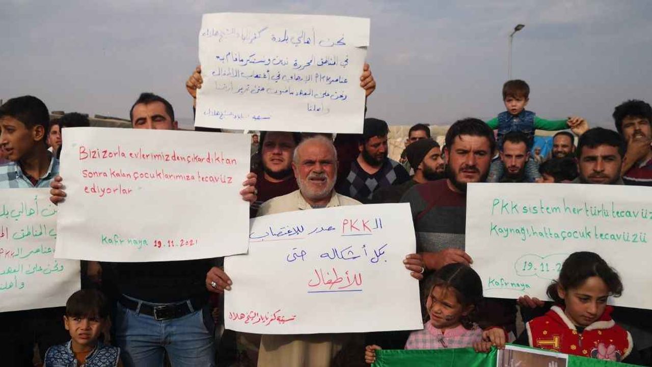 Çoğunluğunu yerinden edilmiş Kefernayalilerin oluşturduğu protestocular, çocuk istismarından YPG/ PKK’lıları sorumlu tutarak, terör örgütünden hesap sorulmasını istedi.
